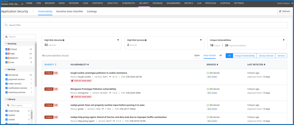 Unlike static scanners, Atatus correlates findings with APM traces and logs to confirm whether a vulnerability is actively reachable. The dashboard surfaces every detail clearly, library name, version, CVE ID, CWE, EPSS score, affected service, and exposure window, so teams know exactly what they are dealing with.
