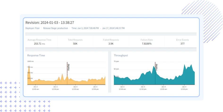 Monitor every deployment in real-time to identify errors and performance issues before customers do. You can observe the positive or negative impacts before and after release, tracking how specific deployments affect your software's health and performance. Additionally, ensure that issues are resolved with application monitoring at each deployment.