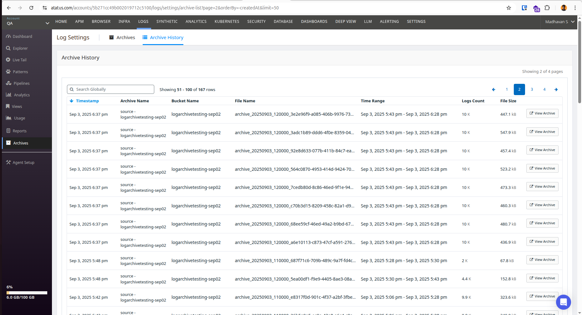 Released on: September 2025Log Archives in Atatus let you store all of your ingested logs in long-term, cost-efficient storage solutions like AWS S3. While Atatus is optimized for real-time log analysis, monitoring, and alerting, not every log needs to be kept in the system for instant access all the time. With Log Archives, you can choose to store all logs in your cloud storage, or apply filters to archive only the logs you care about. The selected logs are automatically stored in your cloud archive and remain available whenever you need them—for compliance, cost efficiency, or future investigations.