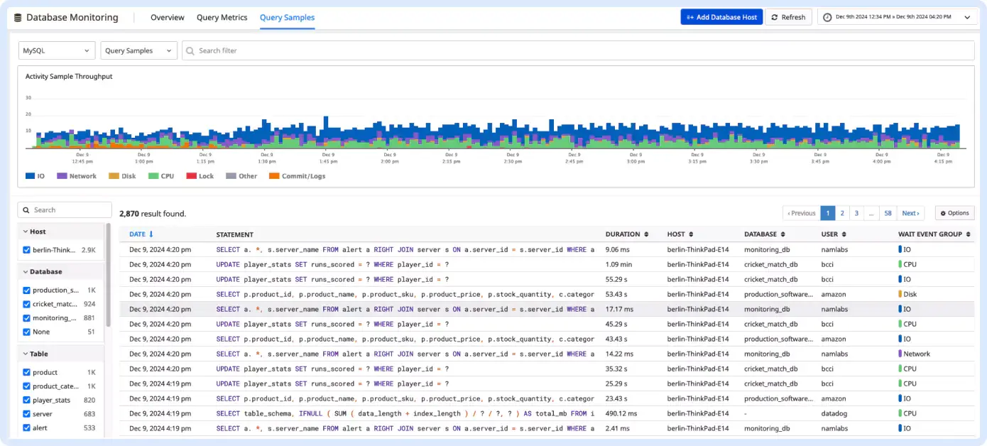 - Index and Cache Efficiency: Monitor index usage and cache hits to improve query execution efficiency, reducing unnecessary database load and ensuring faster data retrieval.